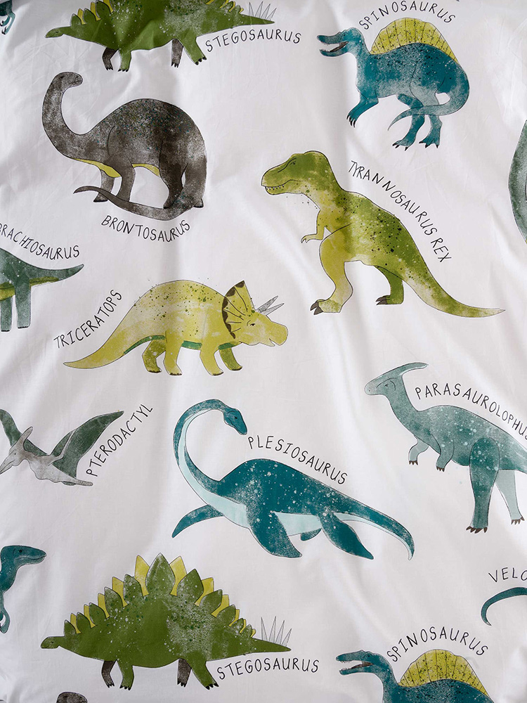 Bring your little dinosaur-enthusiasts imagination to life with this awesome design. These watercoloured dinosaurs are easy to identify with their names spelt across the duvet cover, in bold splashes of tonal greens and teals on a fresh white ground. This design is printed on cotton with the same print front and reverse.