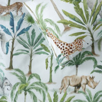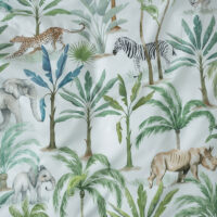 Welcome to Jungle Oasis! Let your little explorer embark on a safari teeming with majestic elephants, playful giraffes, fierce tigers and many more jungle friends. Amidst a mint ground lush with tropical trees, these animal pals roam a magical realm. Printed on 100% cotton, this design reverses to a matching palm tree print.
