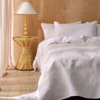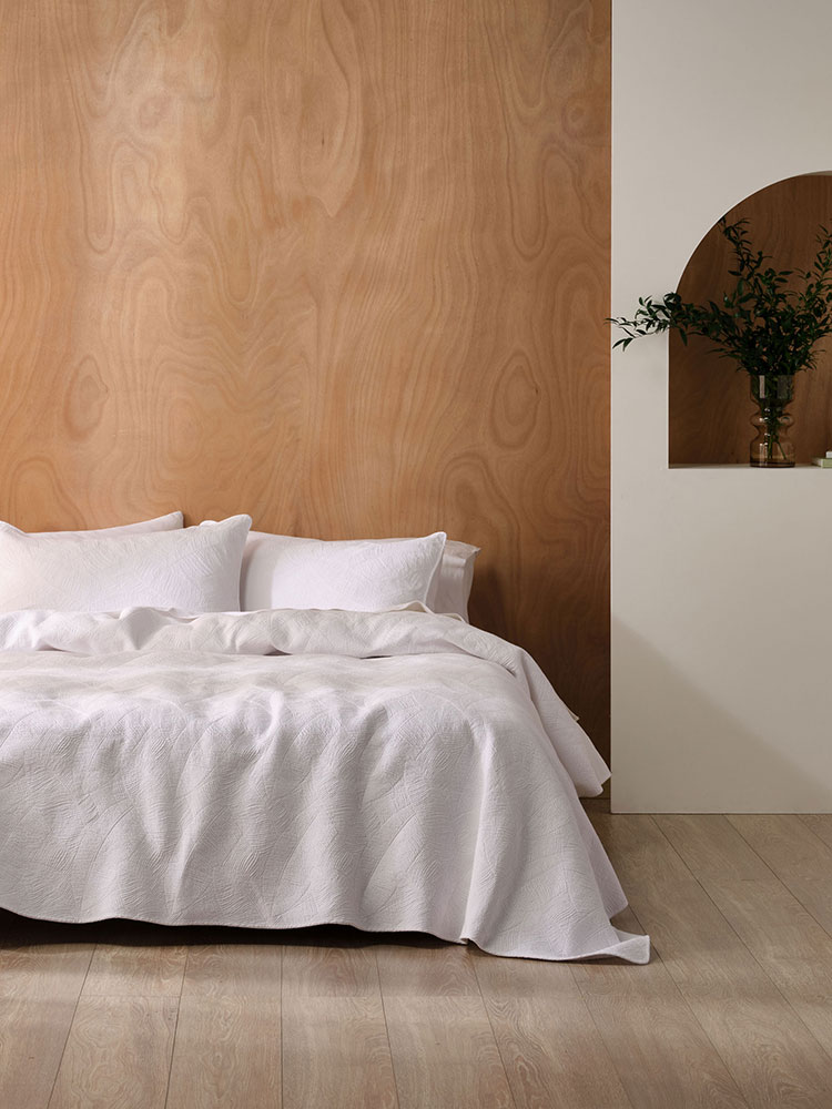 Add depth and interest to your space with Manon. The delightful leaf textured quilted bedcover is a quintessential addition to any space. Made from cotton in a calming natural hue, style Manon with the matching bedlinen to complete the serene atmosphere.