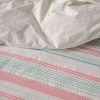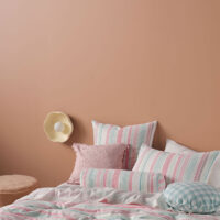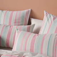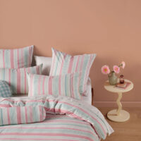 A noughties-inspired number, Otillo is a merging of statement hues and classic textures. This yarn-dyed stripe enjoys various micro-weaves, such as cotton seersucker, waffle and ticking stripes in watermelon, green and aqua-blue. This elevated aesthetic is best adorned with coordinating cushions and throws for your fashion-forward boudoir.