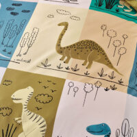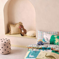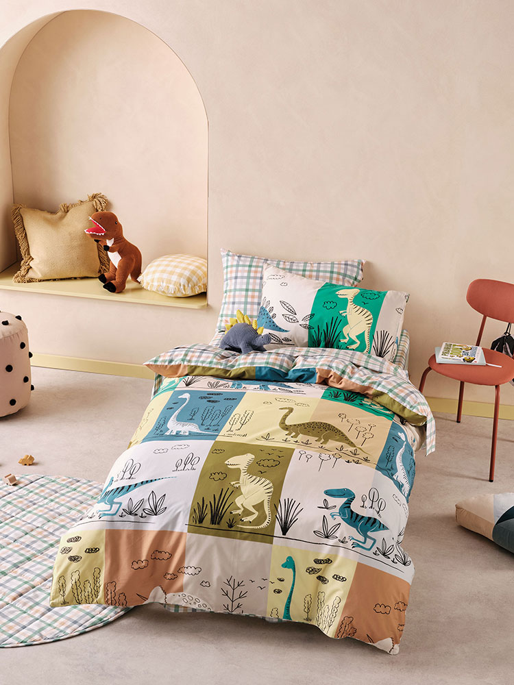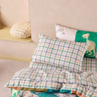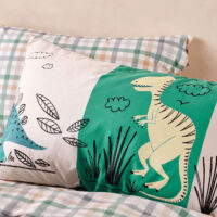Join this prehistoric journey, to a land where dinosaurs roam free! Illustrated by hand in our Melbourne studio, Prehistoric Patchwork’s playful artwork in modern, calming hues is a delight for all kids. Trimmed with cord piping, this GOTS-certified, 250 thread, washed organic cotton percale set reverses to a super-cool, colourful check for another aesthetic.