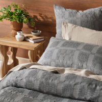 This cotton ensemble reverses to a plain-dyed aesthetic, and looks best styled with a pair of its coordinating pillowcases.