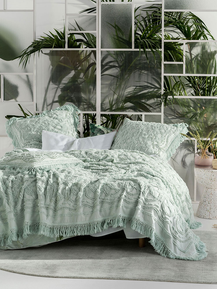 This beautifully nostalgic and intricate bed cover is made from detailed cotton chenille. It’s the absolute perfect in-between for those who get too hot for duvets and too cold for sheets. Complete with tassel fringes, this cover looks even more incredible layered with this seasons duvet covers. This bed cover will generously fit a queen and king size bed.