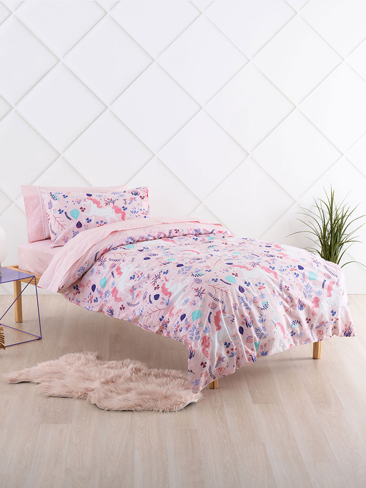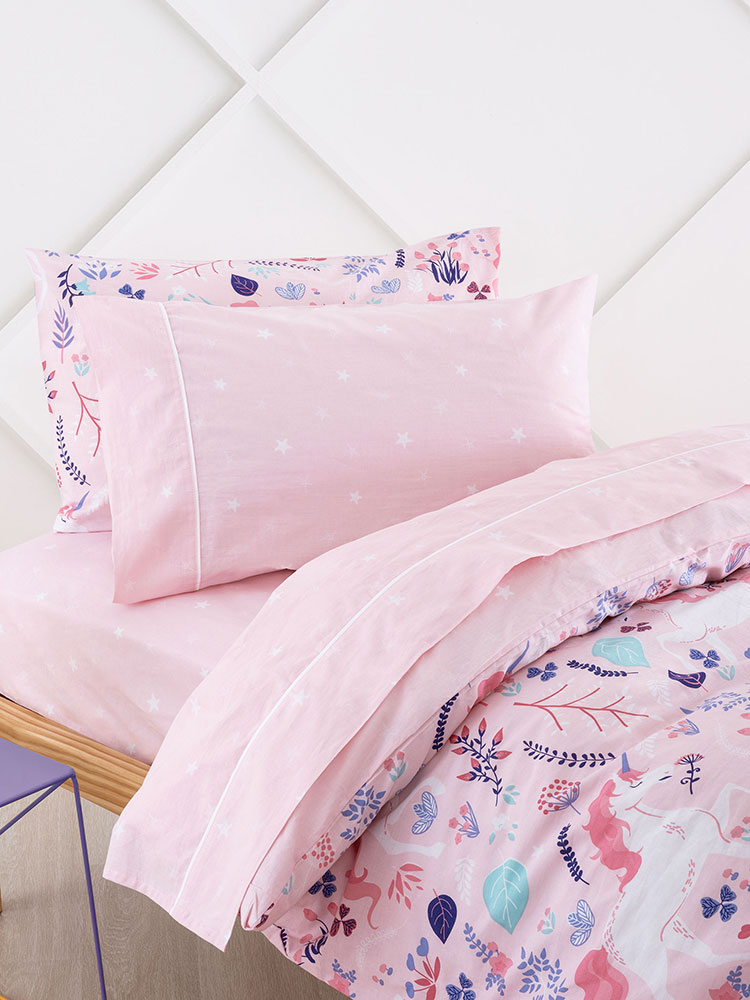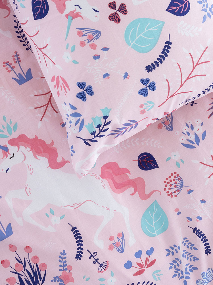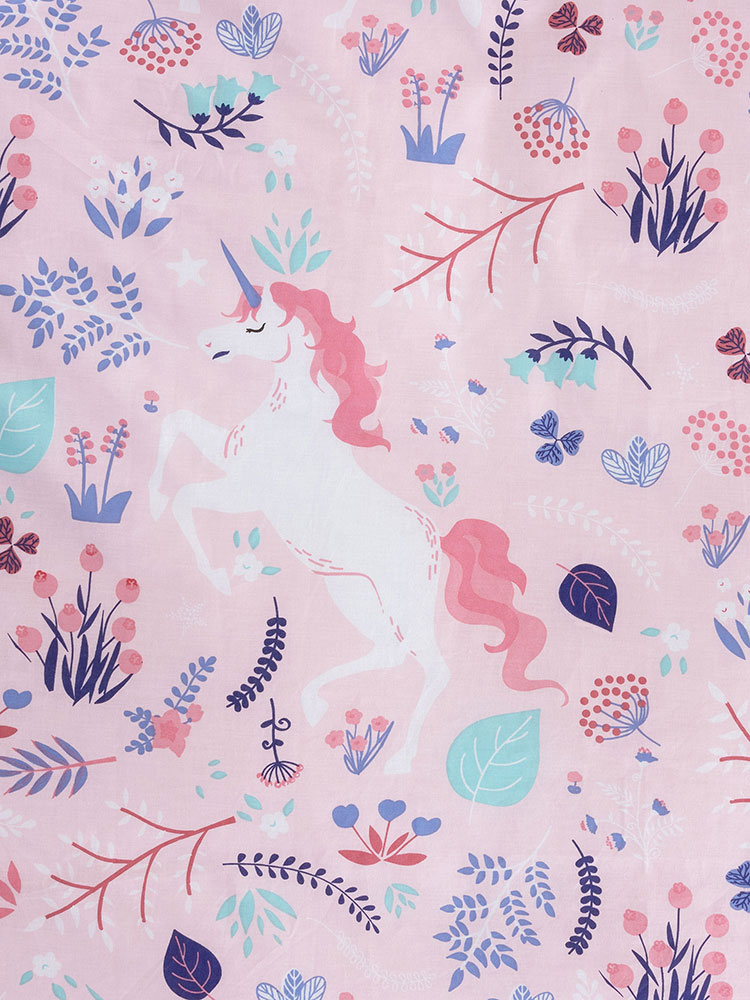 Trotting in this enchanted garden are magical unicorns, surrounded with flora and fauna on a soft pink ground. Printed on 100% cotton, this mystical design reverses to a starry print, which co-ordinates with the Tilly sheet set (sold separately).